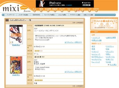 Данная служба позволяет участникам оставлять на сайте свои отзывы и обзоры различной медиапродукции, такой как музыка, кино, манга, книги, игры, компьютерные программы и многого другого. Каждая страница обзора содержит ссылки на соответствующие страницы японской версии сайта Amazon.com где можно приобрести продукт, о котором идёт речь. Как показывает практика, эта функция востребована пользователями и приносит компании mixi, Inc. существенный доход.